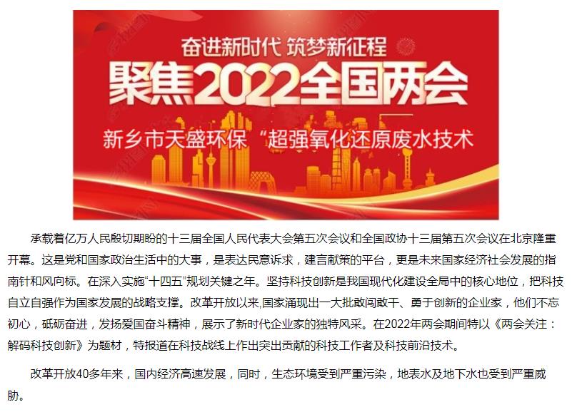 中國高新技術(shù)網(wǎng)發(fā)布:《關(guān)注:解碼科技創(chuàng)新》——新鄉(xiāng)市天盛環(huán)?!俺瑥?qiáng)氧化還原廢水處理技術(shù)”