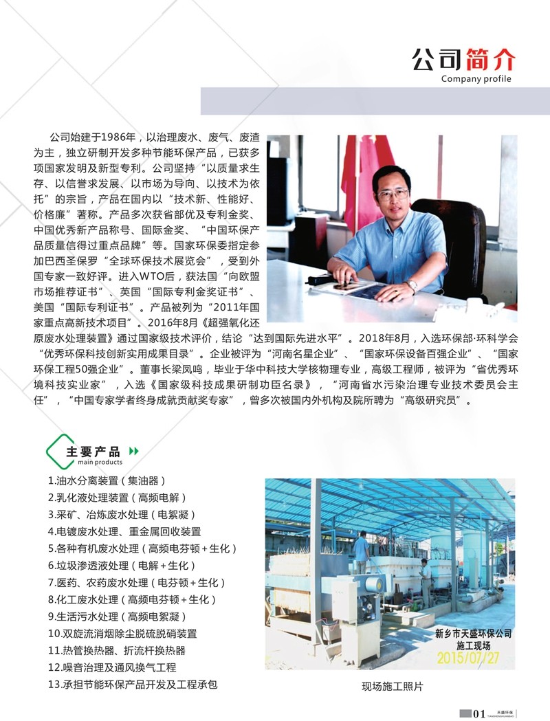 公司始建于1986年,以處理各種有機廢水、各種重金屬廢水為主,獨立研制開發(fā)多種節(jié)能環(huán)保產(chǎn)品,已獲多項國家發(fā)明及新型專利一種電化學(xué)廢水處理裝置 ZL 2013 2 0210949.5。公司堅持“以質(zhì)量求生存、以信譽求發(fā)展、以市場為導(dǎo)向、以技術(shù)為依托”的宗旨。